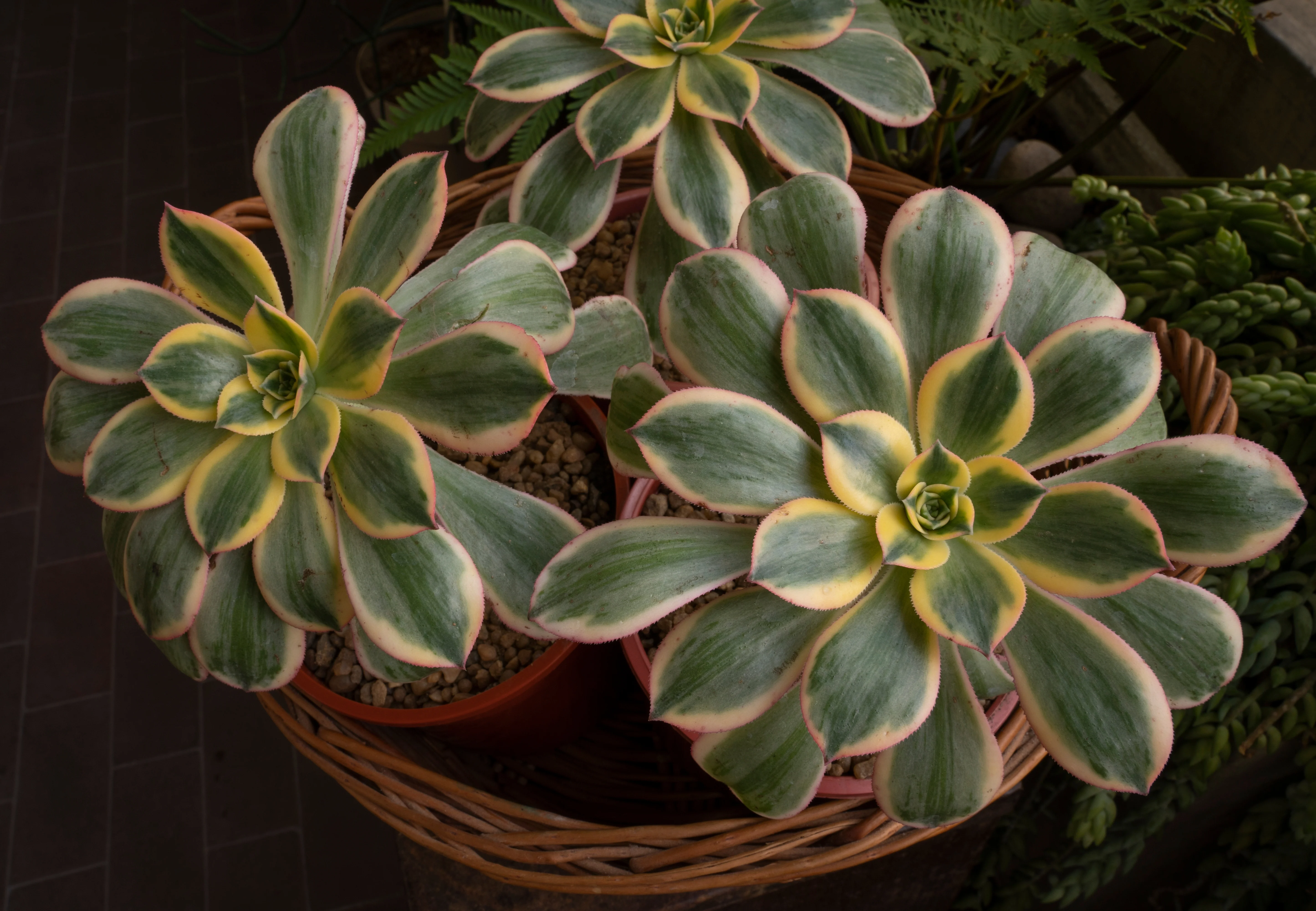 Aeonium ‘Sunburst’ is a highly decorative succulent known for its stunning rosettes of variegated foliage. Each rosette features broad, spoon-shaped leaves with creamy yellow centers, green margins, and delicate pink edges — especially vibrant when grown in bright light.