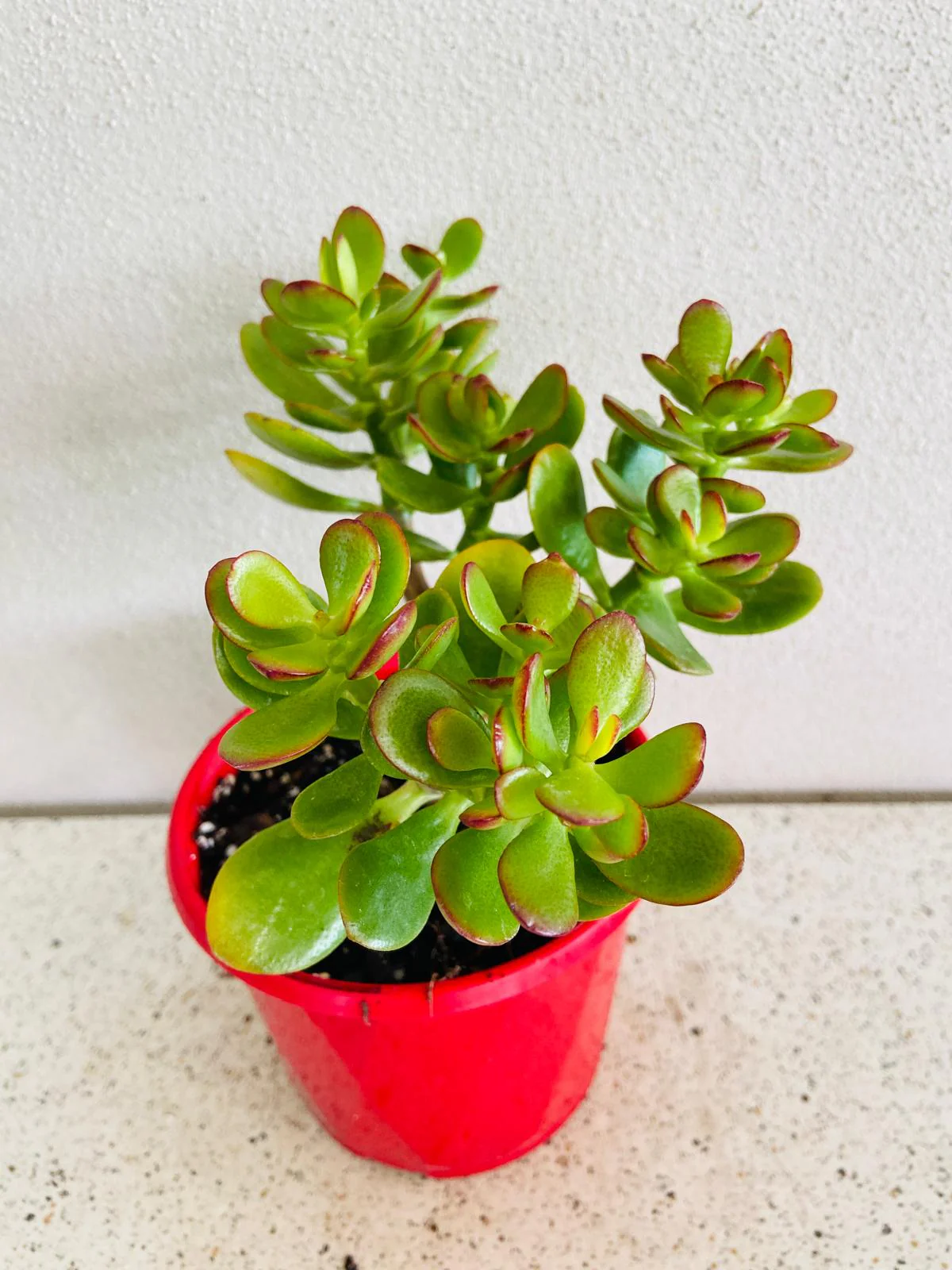 The succulent’s smooth green leaves may develop striking red margins under sunlight, giving it a playful yet elegant two-tone effect.