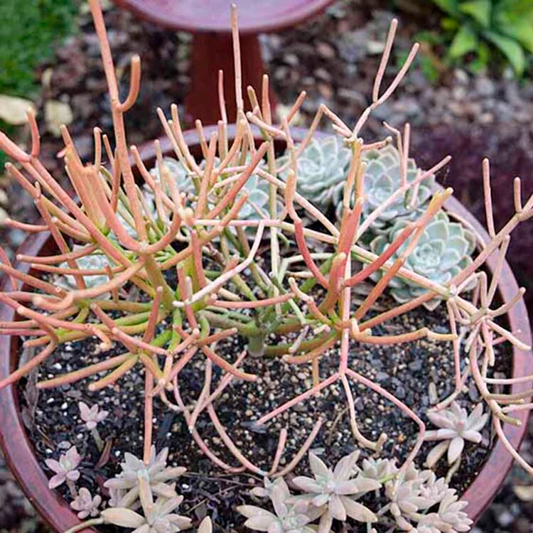 Also known as Sticks on Fire or Pencil Cactus, Euphorbia tirucalli ‘Firesticks’ is a dramatic succulent shrub celebrated for its intense, flame-like colour display. Slender, pencil-thin stems shift from fresh green to brilliant shades of yellow, orange, and fiery red, with the strongest colour developing in full sun and cooler weather.